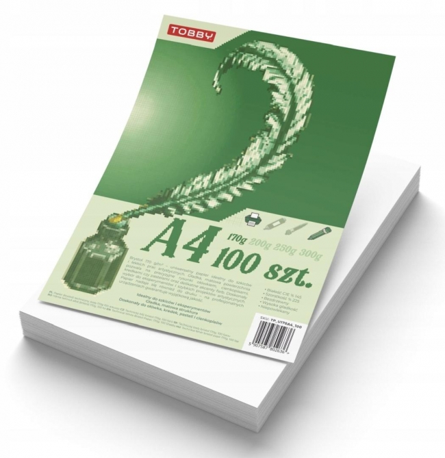 Papier techniczny brystol do druku 170g A4 100 ark. szkiców cienkopisów Papier brystol 170 g/m2 A4 - 100 ark. Ilośc arkuszy: 100 ark. Gramatura: 170 g/m2 Kolor: biały Struktura: techniczny Format: A4 (210 x 297 mm) Biały papier techniczny A4 Uniwersalny papier idealny do szkiców i szybkich projektów artystycznych. Gładka, matowa powierzchnia pozwala na precyzyjne rysunki ołówkiem, cienkopisami, kredkami czy pastelami oraz delikatne akcenty farb. Najważniejsze cechy: Wysoka jakość powierzchni - szorstkość 225% oznacza optymalną przyczepność dla ołówka, cienkopisów i kredek, dzięki czemu rysowanie jest płynne i precyzyjne. Papier bezdrzewny - wykonany z oczyszczonej celulozy, charakteryzuje się trwałością i odpornością na żółknięcie. Idealny do archiwizacji, szkiców oraz projektów, które mają przetrwać lata. Wysoka gładkość - idealna pod wydruki o wysokiej rozdzielczości oraz techniki suche, zapewnia estetyczny wygląd i czyste linie. Niepowlekany - naturalna struktura papieru bez chemicznych powłok sprawia, że jest przyjazny dla środowiska i doskonale przyjmuje różne media rysunkowe. Nadaje się również do druku Nasz papier techniczny jest idealny do codziennych zastosowań - drukowania i kserowania Gwarantuje czyste i precyzyjne wydruki Doskonały wybór dla tych, którzy poszukują niezawodności i wyrazistości w codziennym użytkowaniu