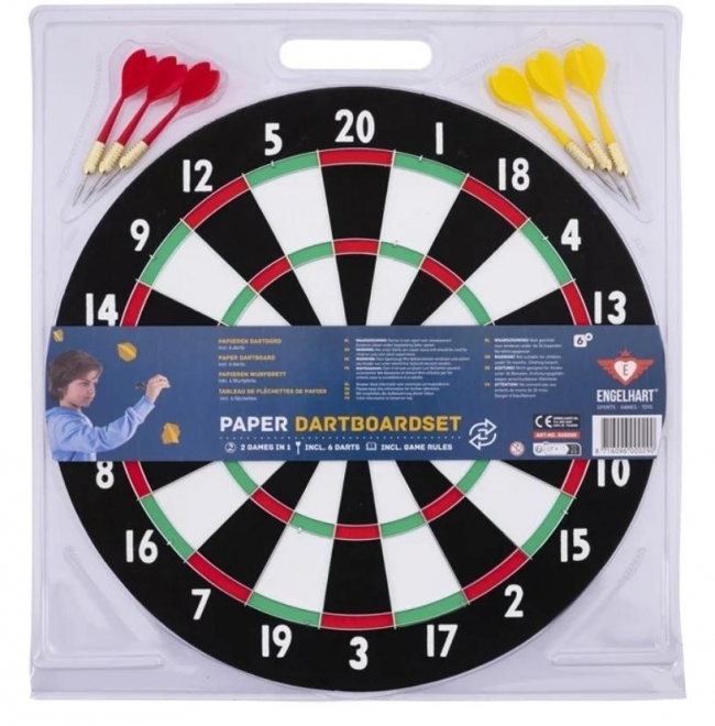 Dwustronna papierowa tarcza do darta z 6 mosiężnymi lotkami o wadze 18 gramów. Grubość tarczy do darta wynosi 1 cm, a średnica 43 cm.