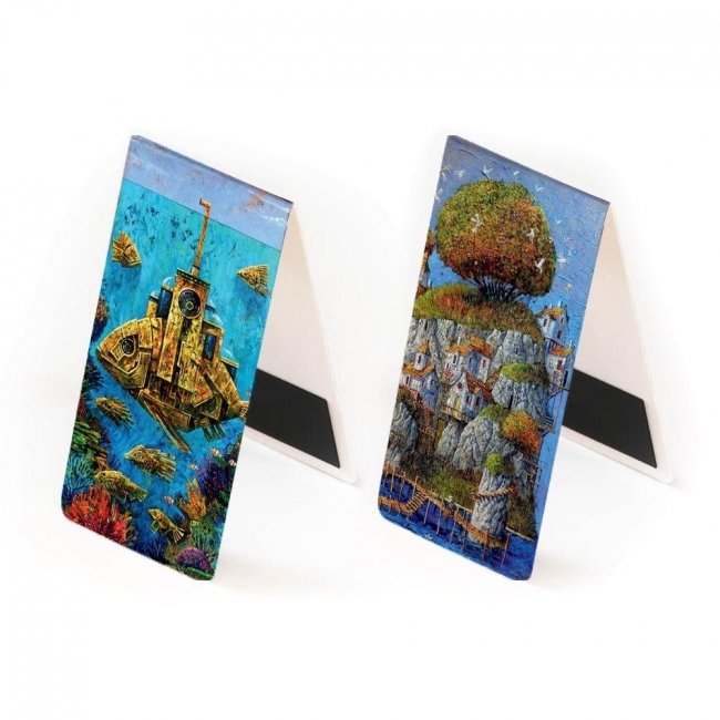 Magnetyczna zakładka do książki z dwoma obrazami wyjątkowego malarza Rocha Urbaniaka! Zaokrąglone rogi, papier kreda 350 g, folia zabezpieczająca błysk, folia magnetyczna na kawałku zakładki