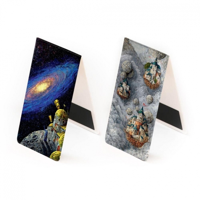 Dwa wyjątkowe obrazy malarza Rocha Urbaniaka! Komandor Lem i Witajcie w Chmurogórzu. Idealne dla kochających science fiction i fantasy! Zaokrąglone rogi, papier kreda 350 g, folia zabezpieczająca błysk, folia magnetyczna na kawałku zakładki