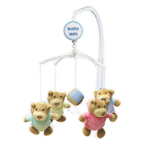 Karuzelka nad łóżeczko Baby Mix z pluszowymi zabawkami pomaga rozwijać wzrokowo-ruchową koordynacja dziecka i uspokaja dziecko przed zasypianiem. Po uruchomieniu gra melodie i obracają się zabawki. Przeznaczony dla dzieci, które jeszcze nie poruszają się. Kolor zabawek jest różny w zależności od aktualnej oferty. Wysokość zabawek jest 12 cm.
