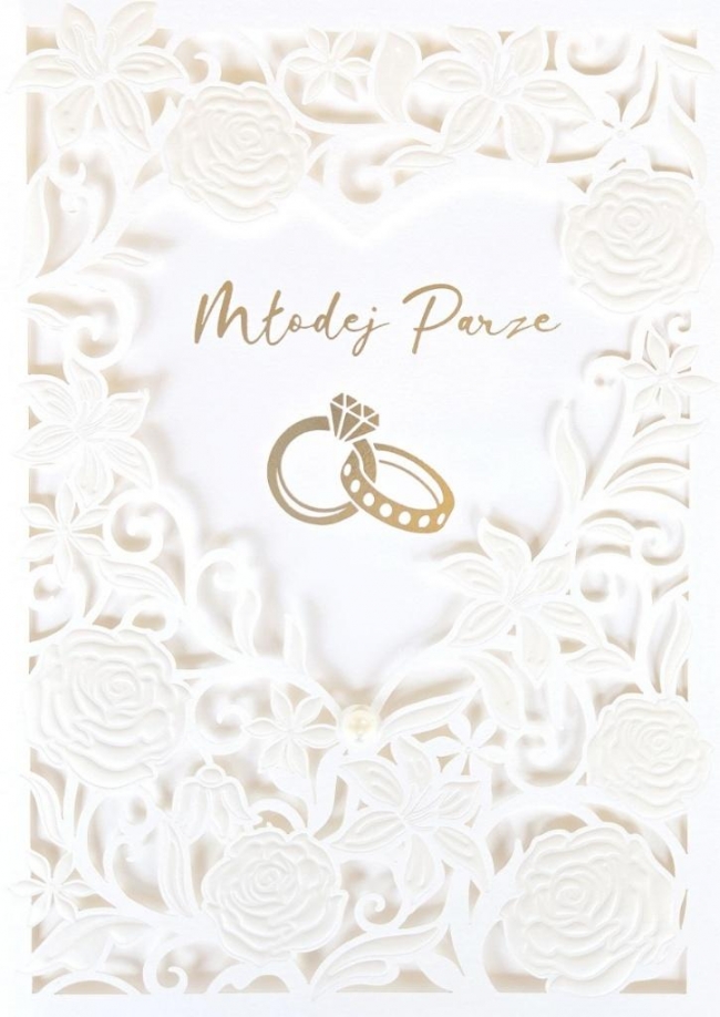 Elegancki karnet na Ślubny w formacie B6 z laserowo wycinanym wzorem. Delikatny, ażurowy motyw z symbolami ślubnymi. Wewnątrz miejsce na życzenia. Idealna pamiątka tego ważnego dnia.