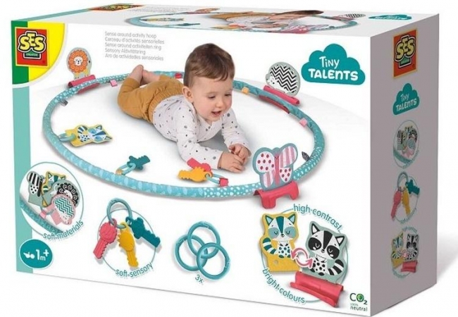 Dzieci mają wiele do odkrycia na tym kółku do zabawy moga to robić wszystkimi zmysłami. Zabawne, dwustronne karty ze zwierzętami, kolorowe i czarno-białe, z motywami takimi jak silny lew lub puszysty kot, są idealne do rozpoznawania kontrastów oraz podnoszenia i trzymania główki. Kolorowe klucze idealnie nadają się do podgryzania i gryzienia podczas ząbkowania, a na niebieskich kółkach można zawiesić dodatkowe przedmioty.
