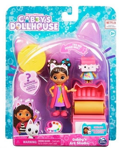 Namaluj własne dzieło razem z Gabi i zestawem Koci Domek Gabi Pracownia Artystyczna! Ten zabawny zestaw zabawek zawiera 9,6-centymetrową figurkę kolekcjonerską Gabi, Tekturzątka, mebel do gabinetu artystycznego, akcesorium w postaci palety do malowania, a także tajemnicze pudełko do kociego domku z niespodzianką w środku! Tak jak Gabi w serialu, rozpakuj swoją specjalną przesyłkę dla kociego domku i odkryj tajemniczy dodatek do zestawu. Co znajdziesz w środku? Po odkryciu użyj swojej wyobraźni, aby odegrać własne przygody z Gabi i Tekturzątkiem! Włóż paletę lub tajemnicze akcesorium do ręki Gabi i pomóż jej wykazać się kreatywnością w pracowni. Naciśnij kocie uszy Gabi i obserwuj, jak jej bluza zmienia się z czystej na poplamioną farbą! Naciśnij ponownie kocie uszy, aby wyczyścić bluzę. To takie zabawne! Następnie udawaj, że wyciągasz papier kraft z rolki - ona naprawdę się kręci! Ta zabawka dla dzieci jest idealnym prezentem i może być używana z kocim domkiem Gabi (sprzedawanym oddzielnie). Odkryj więcej możliwości opowiadania historyjek dzięki wszystkim zestawom Gabby's Dollhouse, jak zestawie ogrodowym Flower-rific Garden i Kitty Karaoke (każdy sprzedawany oddzielnie)! Dodatkowa niespodzianka: zeskanuj kod QR wewnątrz przesyłki dla kociego domku, aby odblokować specjalną nagrodę w darmowej aplikacji Gabby's Dollhouse App (dostępnej na iOS i Android). Przynieś do domu Zestaw Pracownia Artystyczna i dołącz do Gabi z Kociego Domku Gabi w zabawie w malowanie!