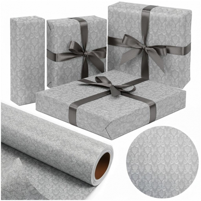 Stylowy i ponadczasowy - papier ozdobny GREY/SILVER DAMASK doda każdemu prezentowi odrobiny luksusu. Delikatny, biało-srebrny wzór w stylu damask pięknie odbija światło, tworząc subtelny efekt głębi i lekkości. To idealny wybór, jeśli chcesz, aby Twój prezent wyglądał wyjątkowo i z klasą. Świetnie sprawdzi się również do dekoracji, pakowania upominków ślubnych czy projektów kreatywnych DIY