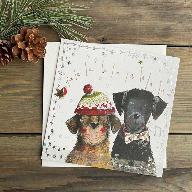 Opis: Karnet Święta kwadrat Świąteczne psy La la la
