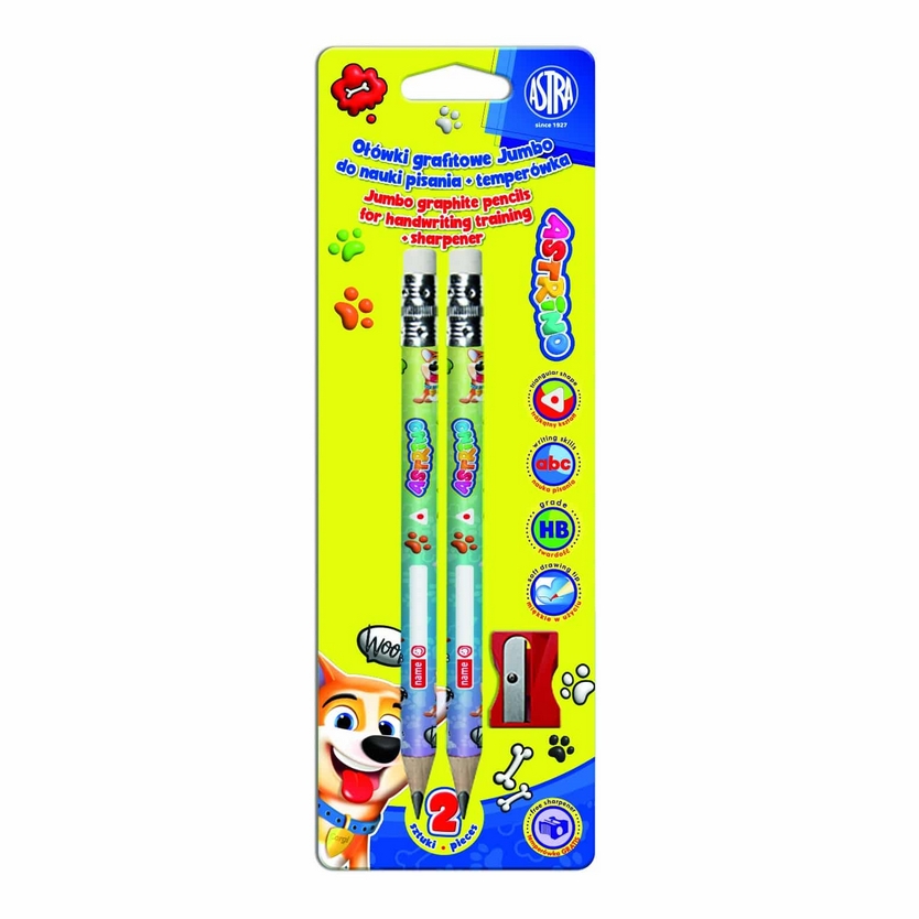 Opis: Ołówki grafitowe trójkątne Jumbo HB z gumką do nauki pisania + temperówka
