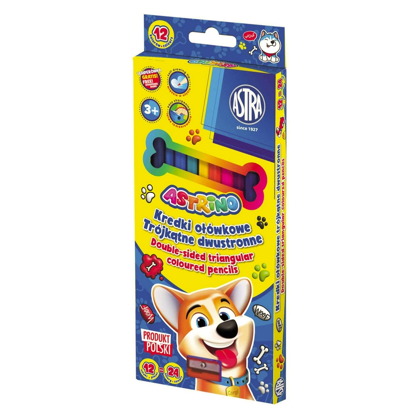 Opis: Kredki trójkątne dwustronne z temperówką, 24 kolory