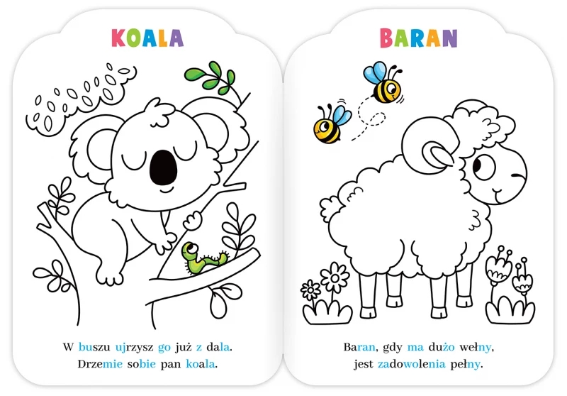 „Malowanki rymowanki” to książka ze starannie narysowanymi wizerunkami sympatycznych zwierzątek i krótkimi oraz zabawnymi wierszykami, zapisanymi z podziałem na kolorowe sylaby.