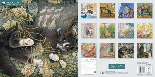 Kalendarz ścienny o wymiarach 300 300 mm, zatytułowany Ivory Cats by Lesley Anne Ivory Wall Calendar 2026 (Art Calendar), wydany przez Flame Tree Publishing. Motywem przewodnim są wyjątkowe ilustracje kotów autorstwa Lesley Anne Ivory, znanej z misternie dekorowanych scen z kotami na tle bogatych, ozdobnych kompozycji. Każda z 12 stron przedstawia jedno z jej uroczych dzieł, a poniżej znajduje się fragment poezji lub krótki opis podkreślający atmosferę ilustracji.