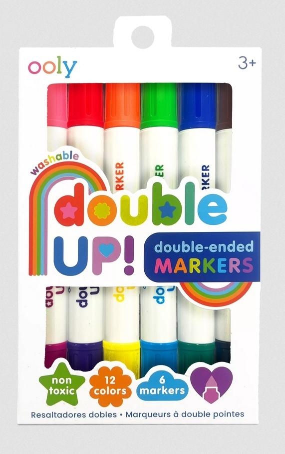 Skoro flamastry mają dwa końce, postanowiliśmy to wykorzystać i podwoiliśmy liczbę kolorów w każdym pisaku! Zastosowaliśmy trwałe i wszechstronne markery, dzięki czemu efekt jest naprawdę imponujący. Choć w zestawie znajduje się sześć markerów, tak naprawdę oferują one dwanaście kolorów. Dzięki temu zajmują o połowę mniej miejsca w piórniku, plecaku czy torebce mamy. Są idealne do rysowania i kolorowania, zarówno w domu, jak i w podróży. Flamastry Double Up są nietoksyczne, łatwo spierają się z ubrań i są odpowiednie dla dzieci od trzeciego roku życia.