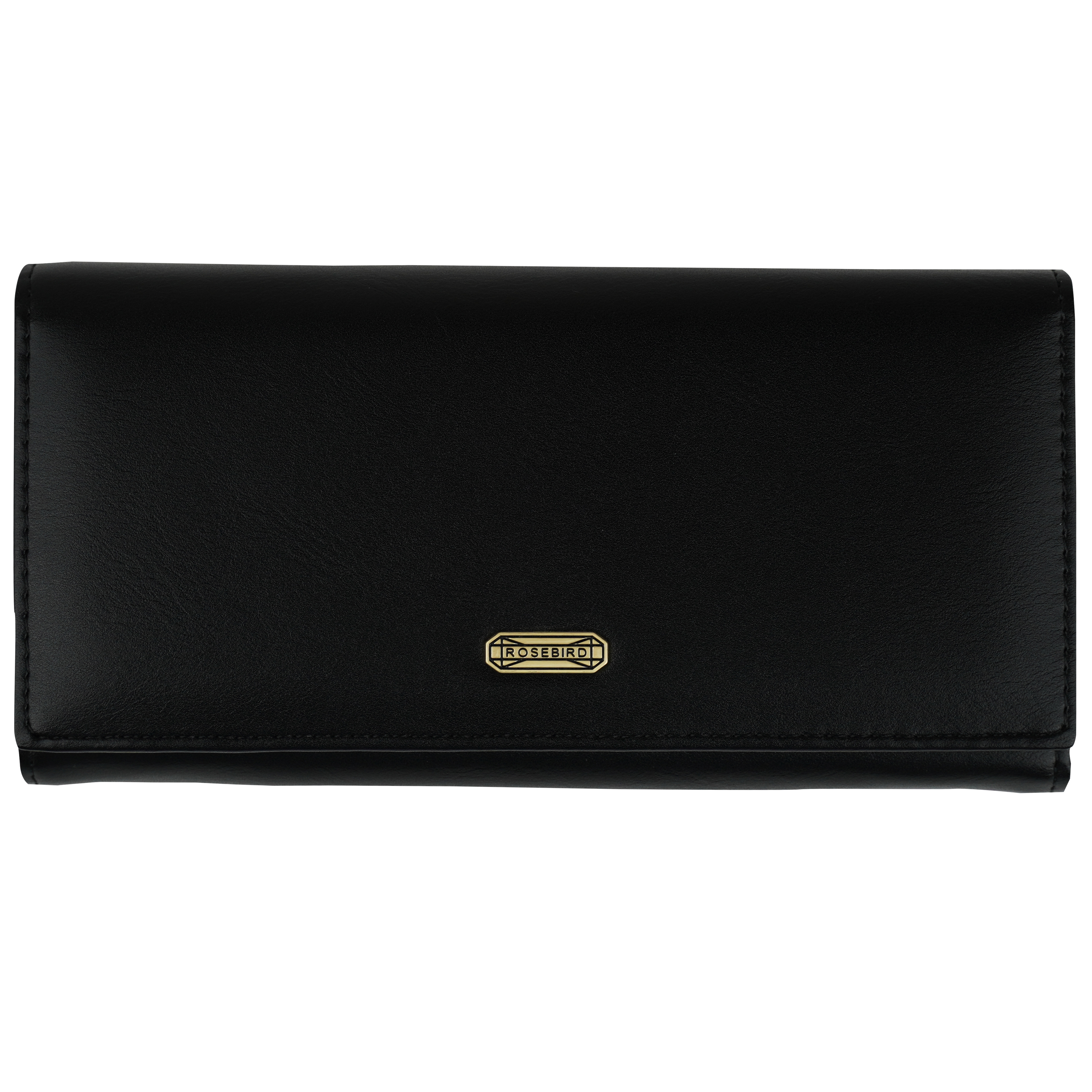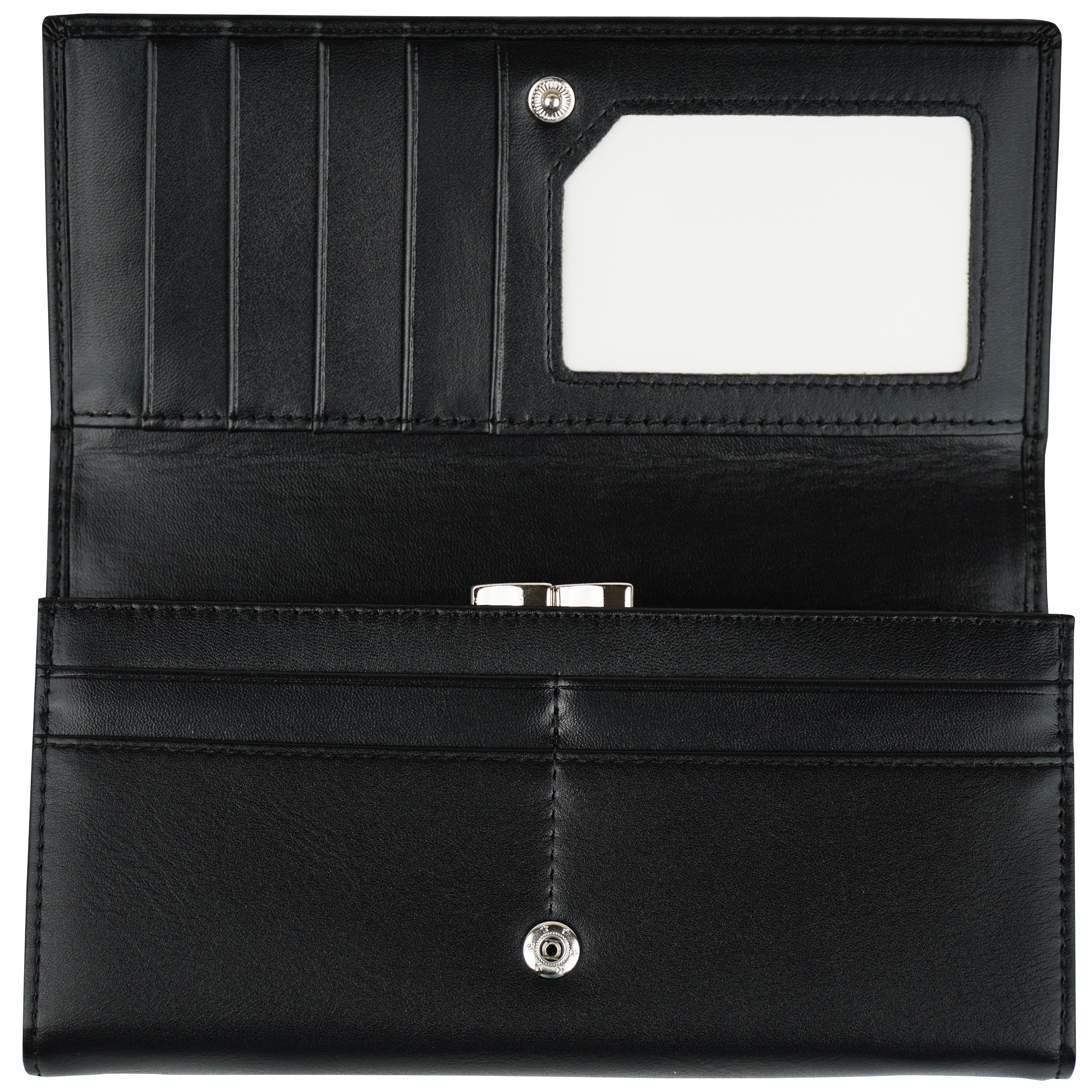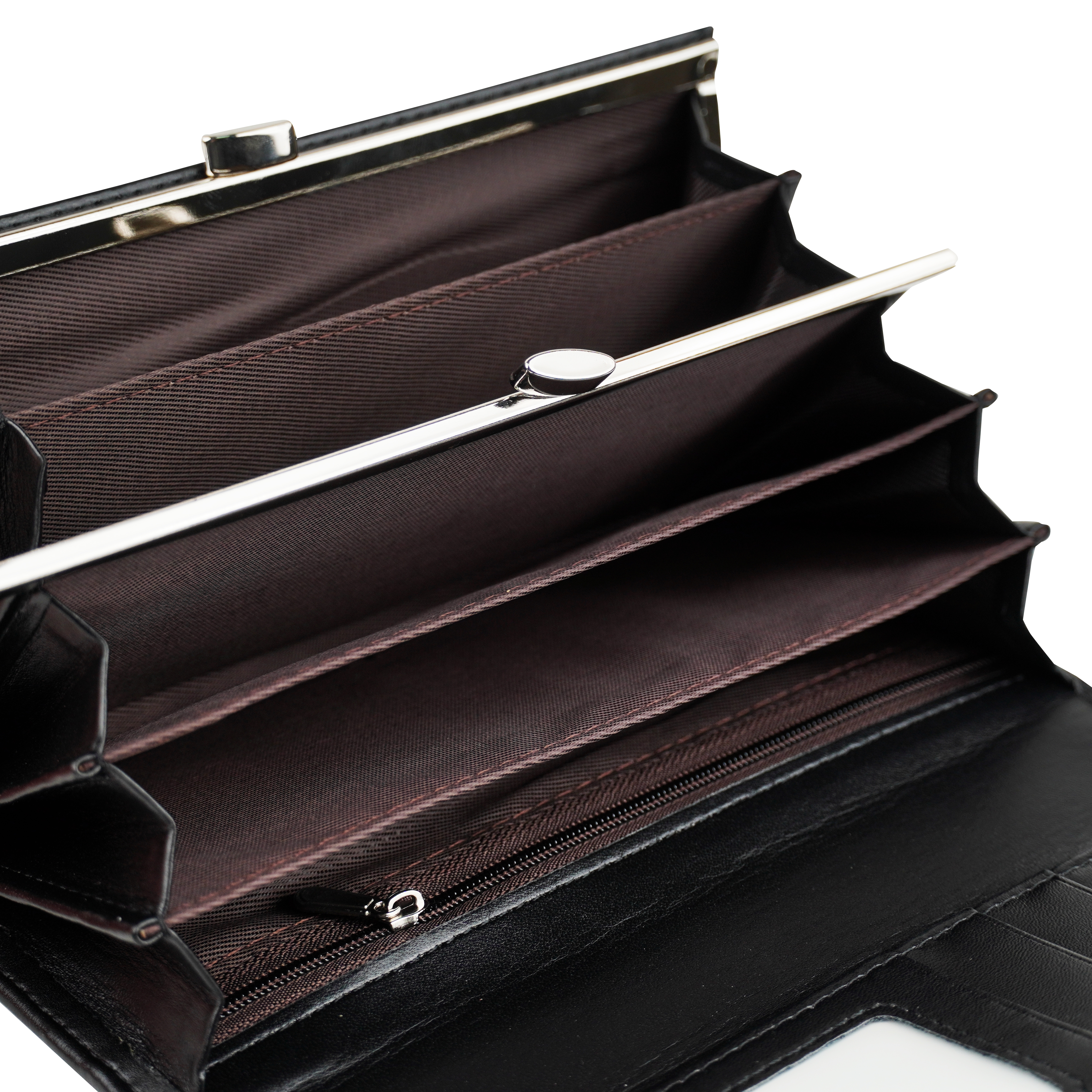 Czarny damski portfel - posiada kilka przegródek na karty, dokumenty i banknoty, przeźroczyste miejsce na zdjęcie i osobną kieszonkę na drobne. Wykonany z materiału przypominającego wizualnie skórę.