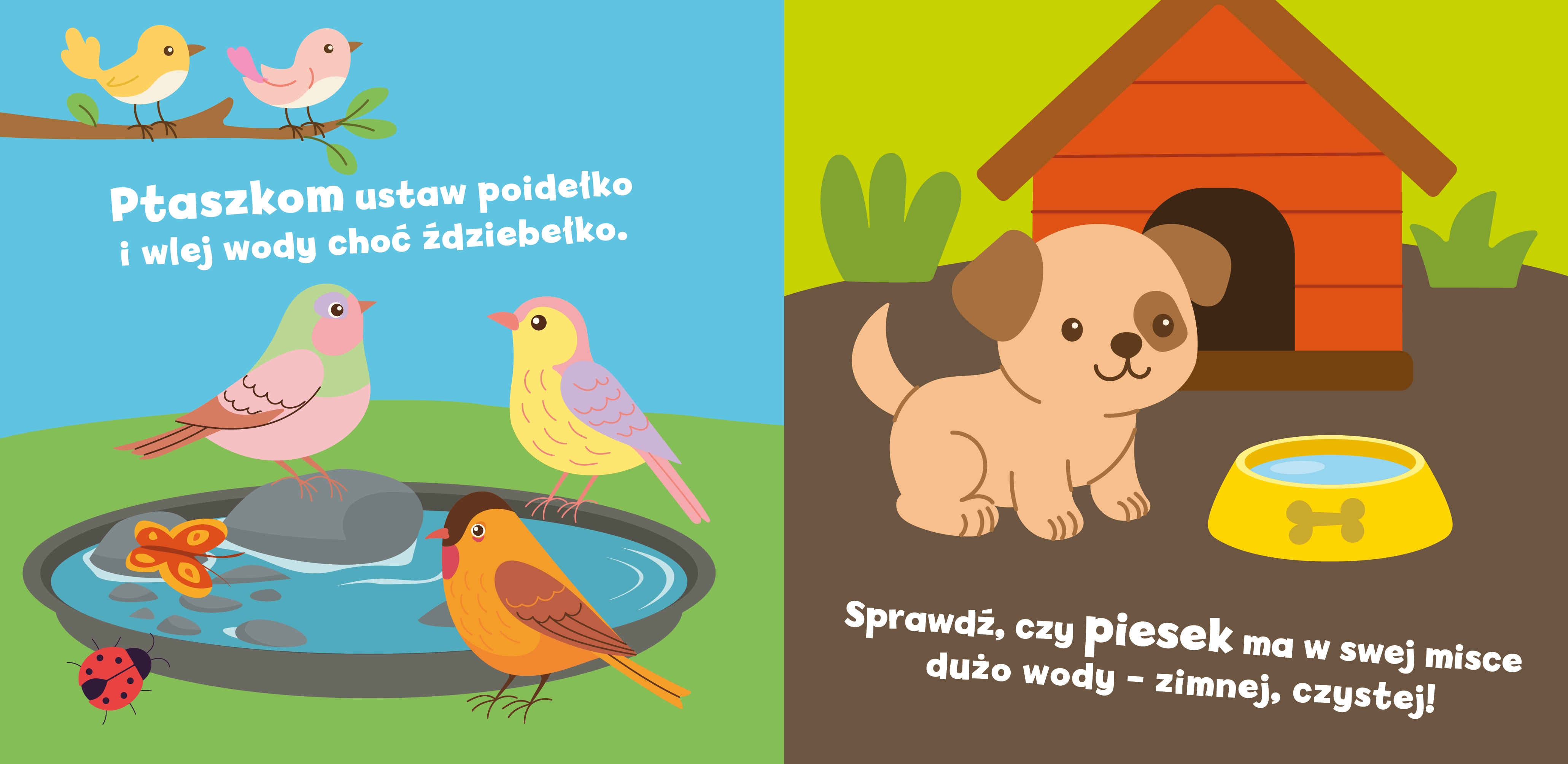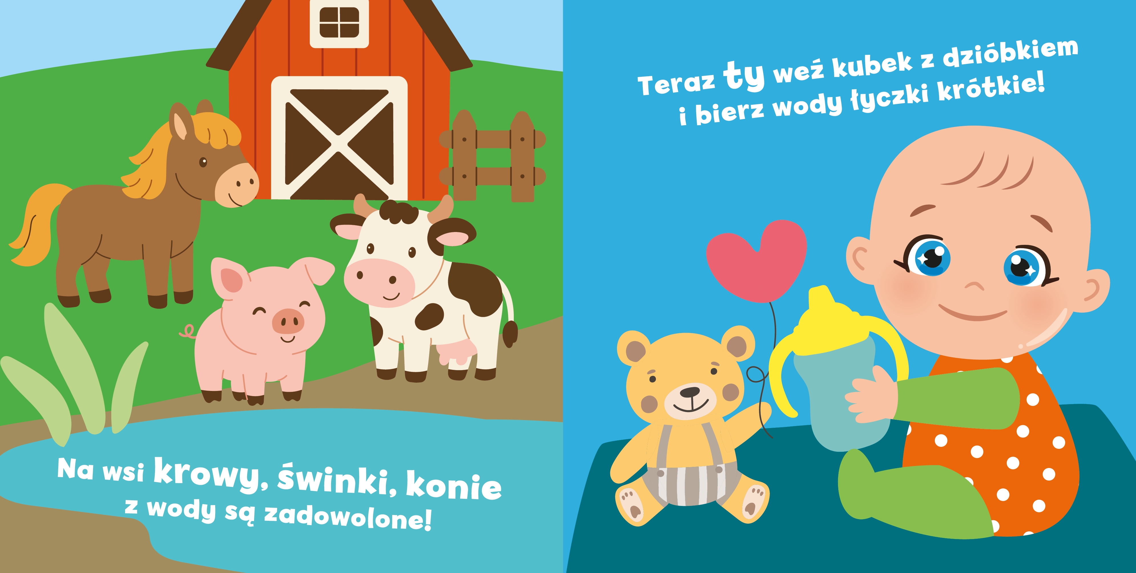 Na jej stronach czeka urocza, rymowana opowiastka o tym, że KAŻDY musi pić. Roślina potrzebuje wody, aby rosnąć, zwierzę – by mieć siłę do zabawy i biegania… a bobas? Oczywiście też! Proste, melodyjne wersy uczą malucha, jak ważna jest woda dla wszystkich istot, a jednocześnie bawią, rozwijając wrażliwość i wyobraźnię.