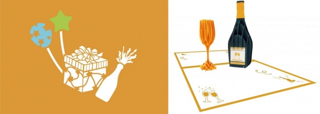 Na okładce znajdują się: prezent, szampan i balony, wycinane laserowo.Po otwarciu karnetu oczom ukazuje się efektowne, trójwymiarowe: szampan i kieliszek. Precyzyjne cięcia papieru tworzą zachwycający efekt POP-UP, który dodaje kompozycji wyjątkowej głębi i elegancji.