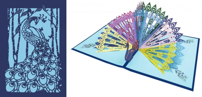 Na okładce znajduje się paw, wycinany laserowo.Po otwarciu karnetu oczom ukazuje się efektowny, trójwymiarowy paw z kolorowym pióropuszem. Precyzyjne cięcia papieru tworzą zachwycający efekt POP-UP, który dodaje kompozycji wyjątkowej głębi i elegancji.