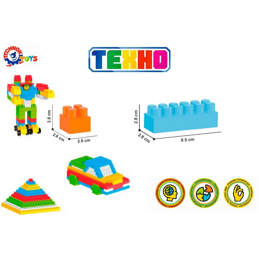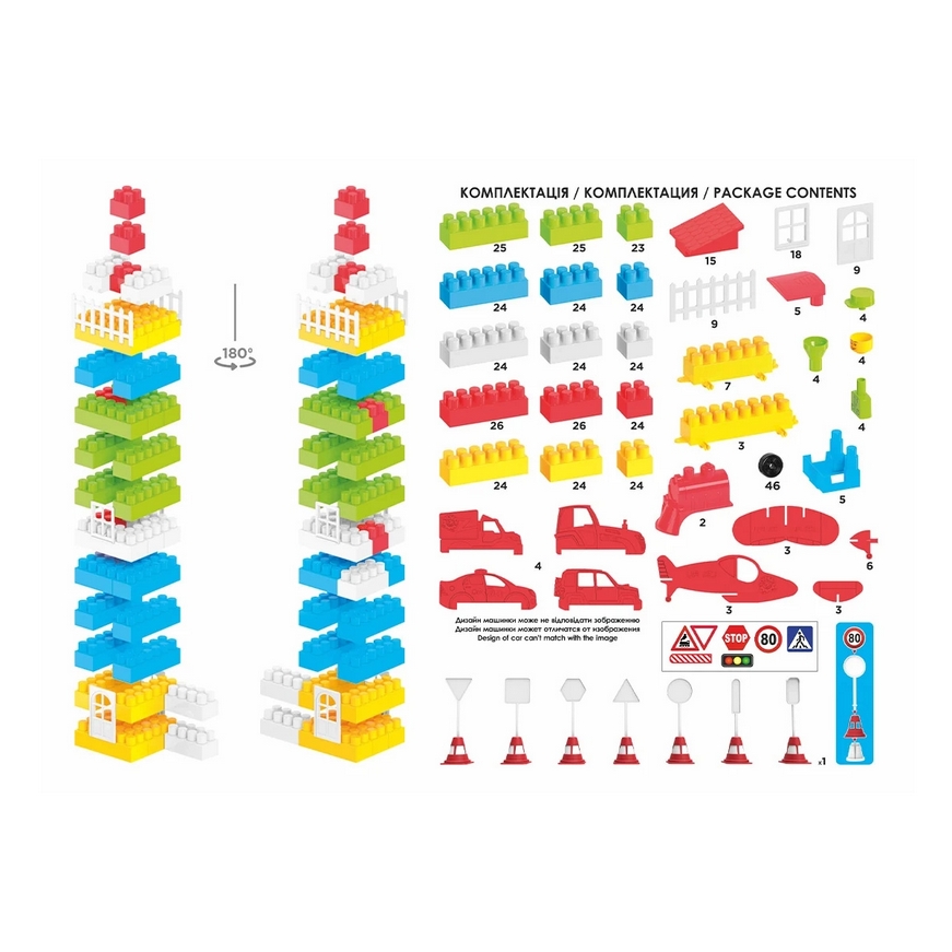 Konstruktor składa się ze standardowych, różnokolorowych bloków plastikowych, a także z elementów szkieletowych i kół, za pomocą których można stworzyć kilka samochodzików.