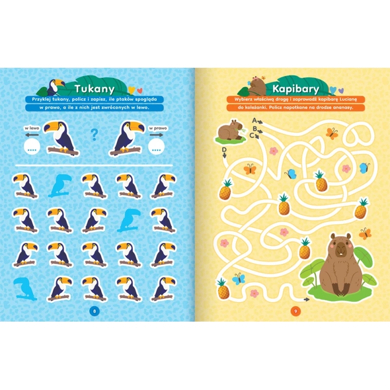 Aktywizujące zadania z naklejkami pomagają dzieciom rozwijać wiele umiejętności. Zachęcają do liczenia, rozwijają spostrzegawczość i sprawność manualną oraz koncentrację uwagi – gwarantują miło i owocnie spędzony czas.