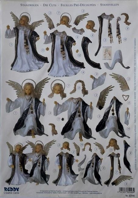 Arkusz do techniki 3 D z wysztancowanymi elementami . Format A-4, nie wymagające wycinania. Oznaczenia cyfrowe pomagają w perfekcyjnym nakładaniu elementów na siebie celem tworzenia wypukłych kompozycji.