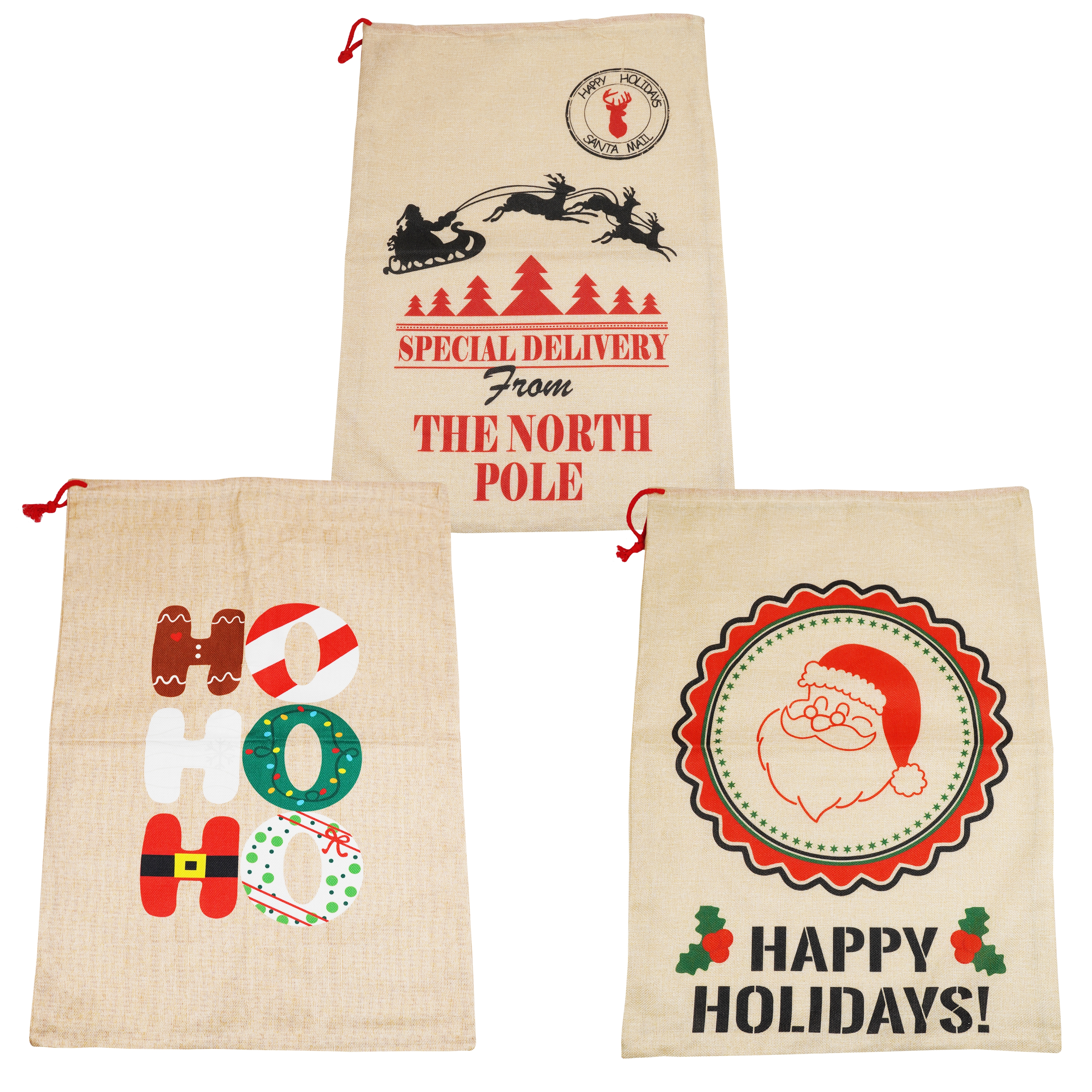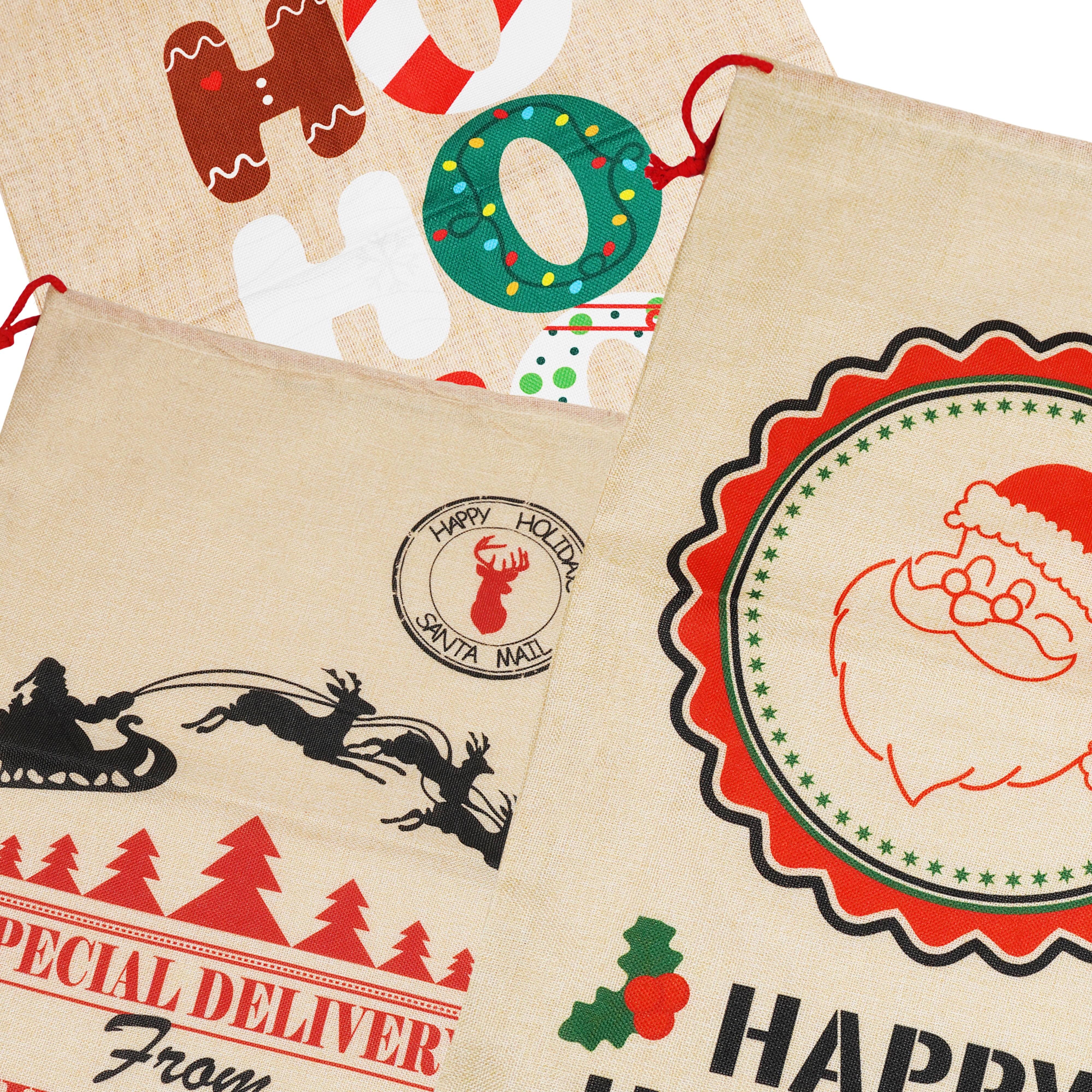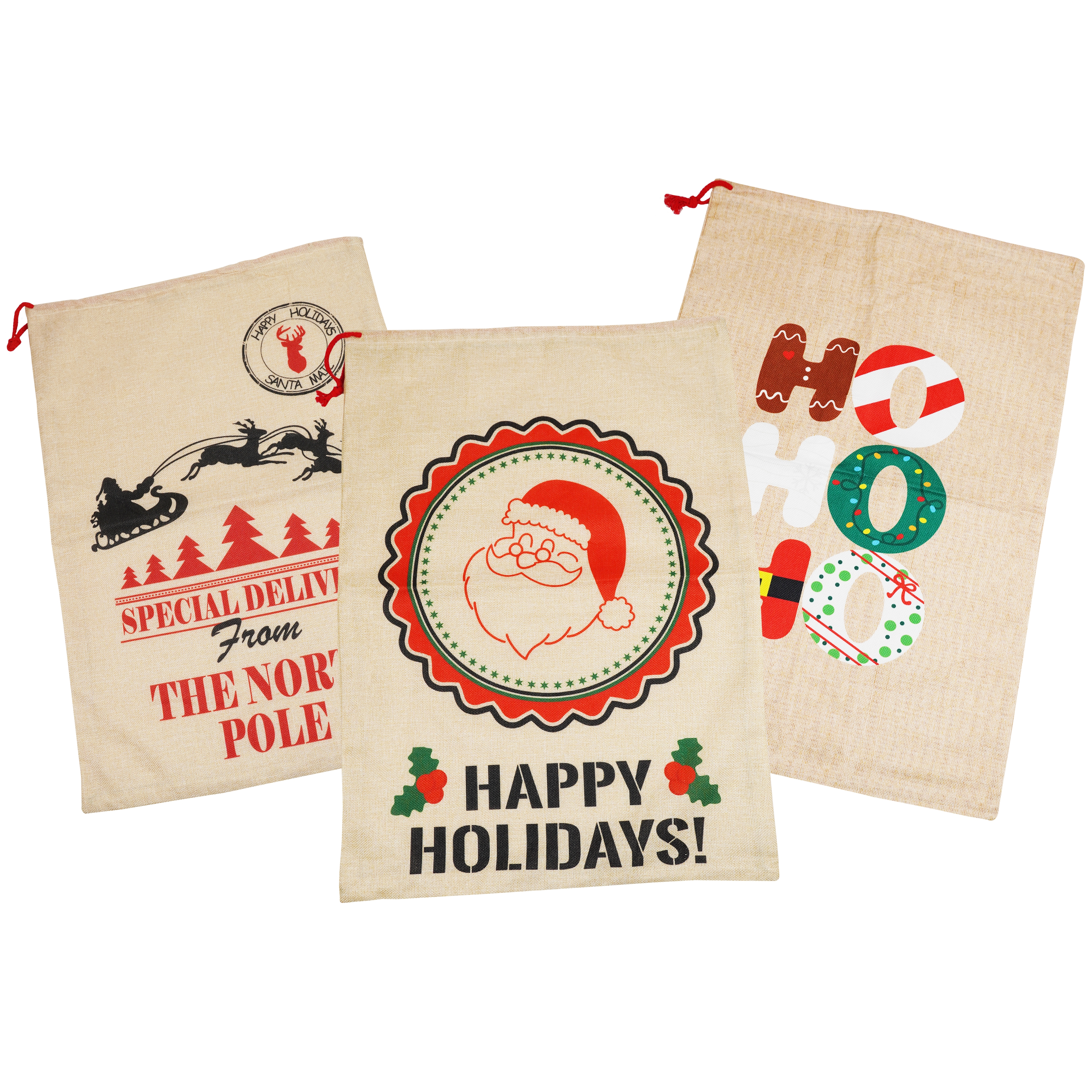 Świąteczny jutowy worek na prezenty z uroczym bożonarodzeniowym nadrukiem. Idealny, żeby schować w nim podarunki dla dzieci!