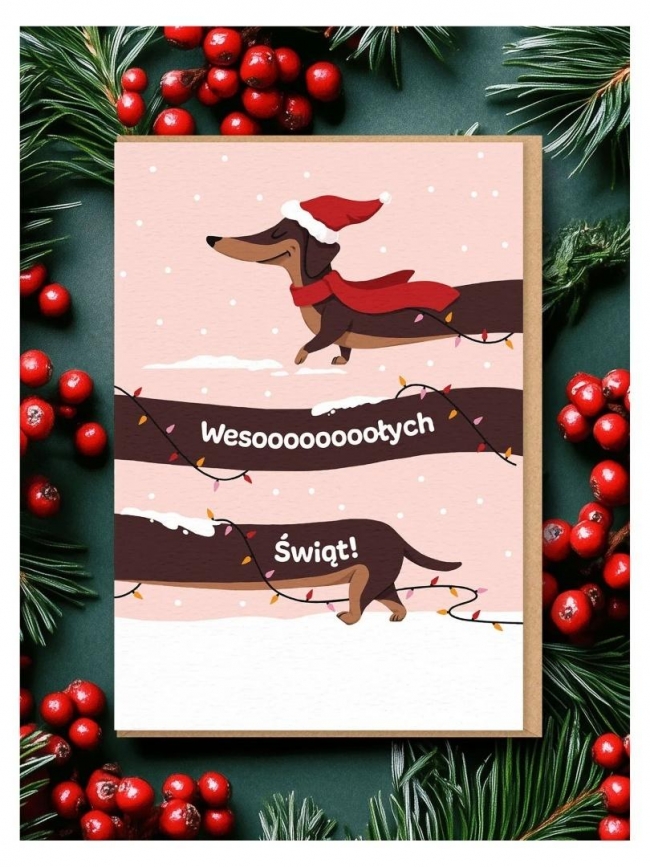 Nie ma świąt bez jamnika w roli głównej! Humorystyczna kartka z uroczym psem, który najwyraźniej wziął sobie za punkt honoru dostarczenie prezentów osobiście. Dla psiarzy, miłośników żartów i tych, którzy wiedzą, że najlepsze święta to te z merdającym ogonem.
