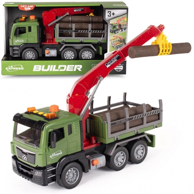 Auto Transport Drewna z Dźwigiem Builder 1:10 to interaktywna ciężarówka z ruchomym chwytakiem, światłem i dźwiękami. Napęd frykcyjny umożliwia swobodną jazdę, a solidne wykonanie zapewnia długą, bezpieczną zabawę. Doskonały prezent dla małego miłośnika pojazdów budowlanych!Producent: