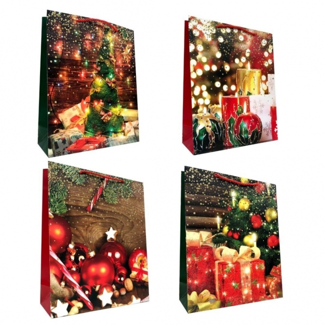 Świąteczna torebka prezentowa wykonana z trwałego papieru, utrzymana w klasycznej, eleganckiej stylistyce. Idealna do zapakowania prezentów pod choinkę, nadaje upominkom wyjątkowy, odświętny charakter. Wyposażona w mocne uchwyty i staranne wykończenie, łączy estetykę z praktycznością.