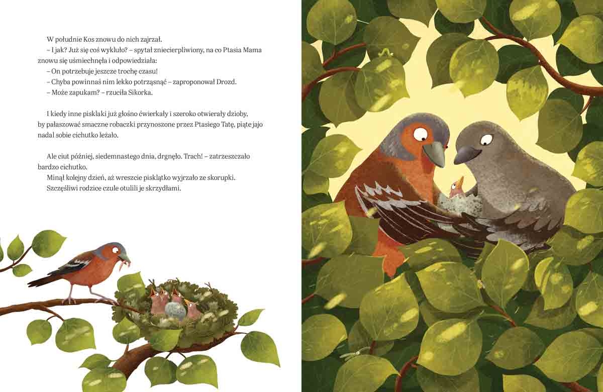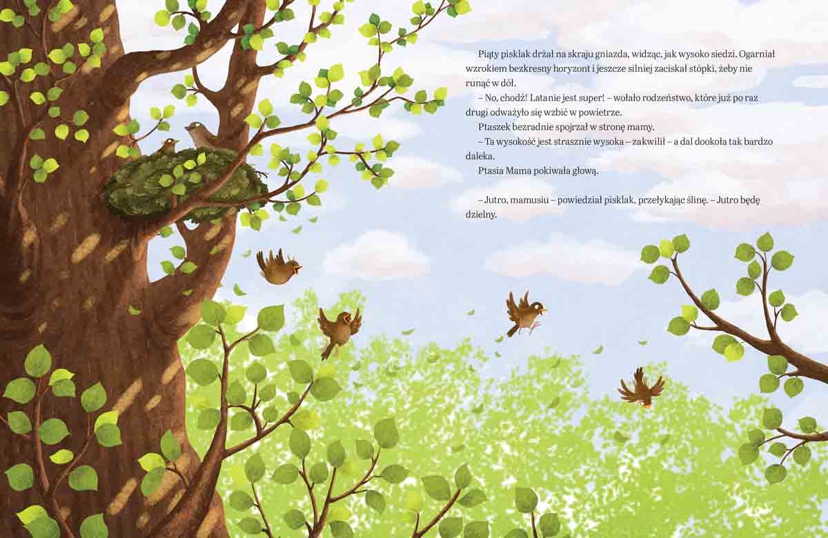 Pewnego dnia Ptasia Mama złożyła pięć jaj. Niedługo wykluło się z nich czworo piskląt, tylko piąte potrzebowało więcej czasu. Podobnie było, gdy maluchy uczyły się latać. Inne ptaki naśmiewały się z piątego pisklaka i namawiały Ptasią Mamę, by wypchnęła go z gniazda. Ale Ptasia Mama była pewna, że właściwy moment po prostu jeszcze nie nadszedł. Czy mały ptaszek kiedyś zbierze się na odwagę i rozwinie skrzydła?