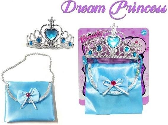 Przedstawiamy czarujący zestaw Dream Princess, który przeniesie każdą dziewczynkę do krainy bajek i królewskich opowieści. Ten dwuczęściowy komplet to kwintesencja elegancji i dziewczęcego uroku, zaprojektowany z myślą o małych damach uwielbiających błyskotki i stylizacje. Głównym elementem jest srebrzysta tiara, misternie zdobiona filigranowym wzorem i uwieńczona dużym, błękitnym kryształem w kształcie serca, symbolizującym królewską godność. Liczne mniejsze, błyszczące kamienie dodają jej blasku. Drugim elementem jest urocza, satynowa torebka w jasnoniebieskim kolorze. Torebka ma pasek z koralików, idealny do noszenia na ramieniu, a klapa ozdobiona jest szykowną kokardą z drobnym różowym akcentem. Całość zapakowana jest w estetyczne opakowanie, co czyni ten zestaw wspaniałym upominkiem urodzinowym lub świątecznym.