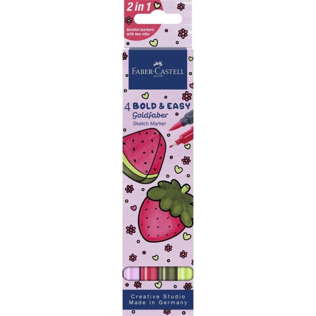 Zestaw pisaków dwustronnych Goldfaber Sketch Faber-Castell 4 szt. z serii Bold & Easy I. Doskonałe dla artystów i hobbystów, zachwycają wszechstronnością zastosowania. Zapewniają łatwe blendowanie bez smug i tworzenie idealnych przejść kolorystycznych. Posiadają dwie końcówki: miękką, elastyczną końcówkę pędzelkową do zadań artystycznych i cienką końcówkę 0,6 mm do konturów i detali. Z szybkoschnącym i permanentnym tuszem na bazie alkoholu. Zatyczki i korpus są wykonane w 100% z materiału pochodzącego z recyklingu, w związku z czym mogą pojawić się niewielkie różnice kolorystyczne.