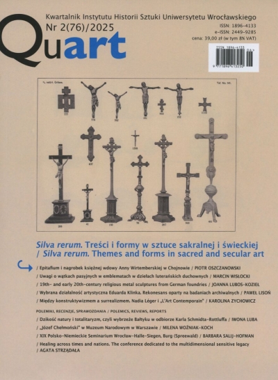 Prezentowany numer kwartalnika zawiera różnorodny wybór tematów i epok, którym Autorki i Autorzy artykułów poświęcili swoją uwagę, oraz nie mniej obfity dział recenzji i relacji. (...) Od redakcji M.in.: - Epirafium i nagrobek księżnej wdowy Anny Wirtemberskiej w Chojnowie / Piotr Oszczanowski - Uwagi o wątkach pasyjnych w emblematach w dziełach luterańskich duchownych / Marcin Wisłocki - 19th- and 20th-century religious metal sculptures from German foundries / Joanna Lubos-Kozieł - wybrana działalność artystyczna Eduarda Klinka. Rekonesans oparty na badaniach archiwalnych / Piotr Lisoń - Między konstruktywizmem a surrealizanem. Nadia Leger i `L`Art Contemporain` / Karolina Zychowicz
