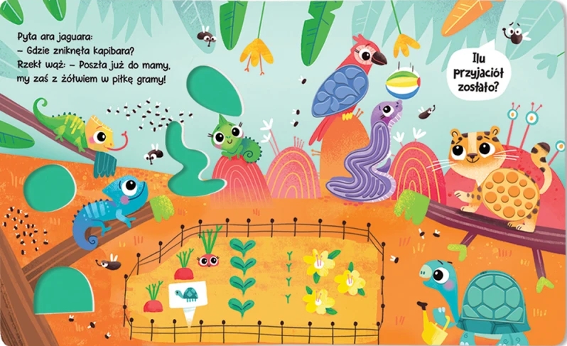 Książeczka sensoryczna z silikonowymi wstawkami i rymowanką to świetny sposób na poznawanie świata i stymulowanie zmysłów maluszka. Z tą książeczką dziecko poznaje zwierzątka z dżungli oraz ich rodziny. Uczy się zasad koleżeństwa i przyjaźni. Dotykając silikonowych wstawek, dziecko bawi się książeczką i ćwiczy spostrzegawczość oraz liczy w zakresie pięciu. Silikonowe wstawki w książeczce mają różnorodne faktury i wzory, a ilustracje sympatycznych zwierzątek urzekają stylem i kolorami. Bohaterowie książeczki z silikonowymi wstawkami to: papuga, wąż, pantera, żółw i kapibara.