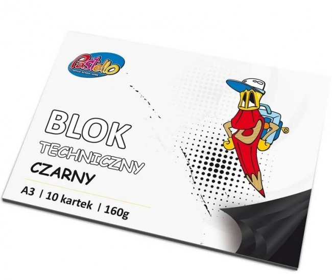 Blok techniczny CZARNY, format A3, 10 kartek, gramatura 160 gram, wysokiej jakości papier. Idealny do tworzenia figur przestrzennych. Doskonały do rysowania pastelami suchymi,pisakami metalicznymi, gel penami, kredą oraz do prac manualnych.