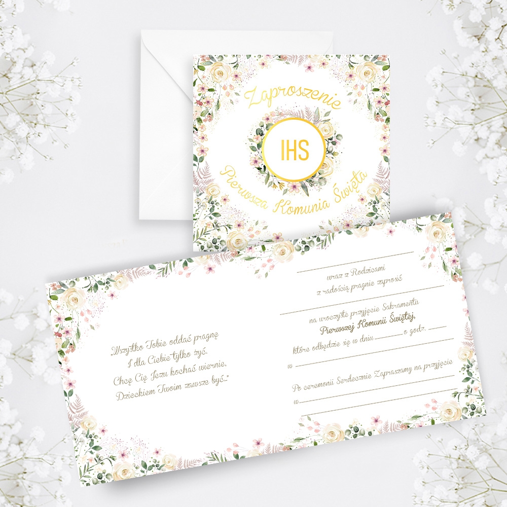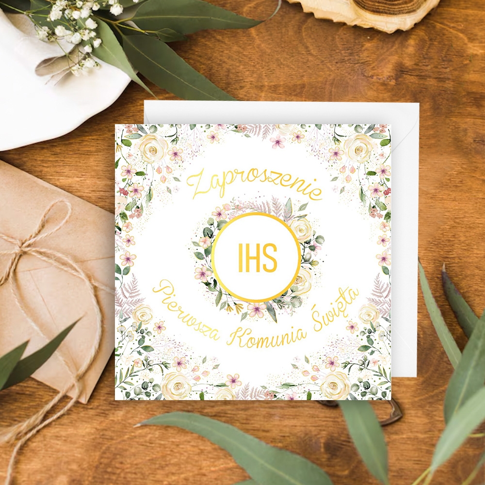 Zaproszenie KW Komunia KIELICH W KWIATACH wydrukowane na wysokiej jakości papierze formatu 15 x 15 cm. Zaproszenia uszlachetnione złotem. W zestawie 5 sztuk zaproszeń i białe koperty.