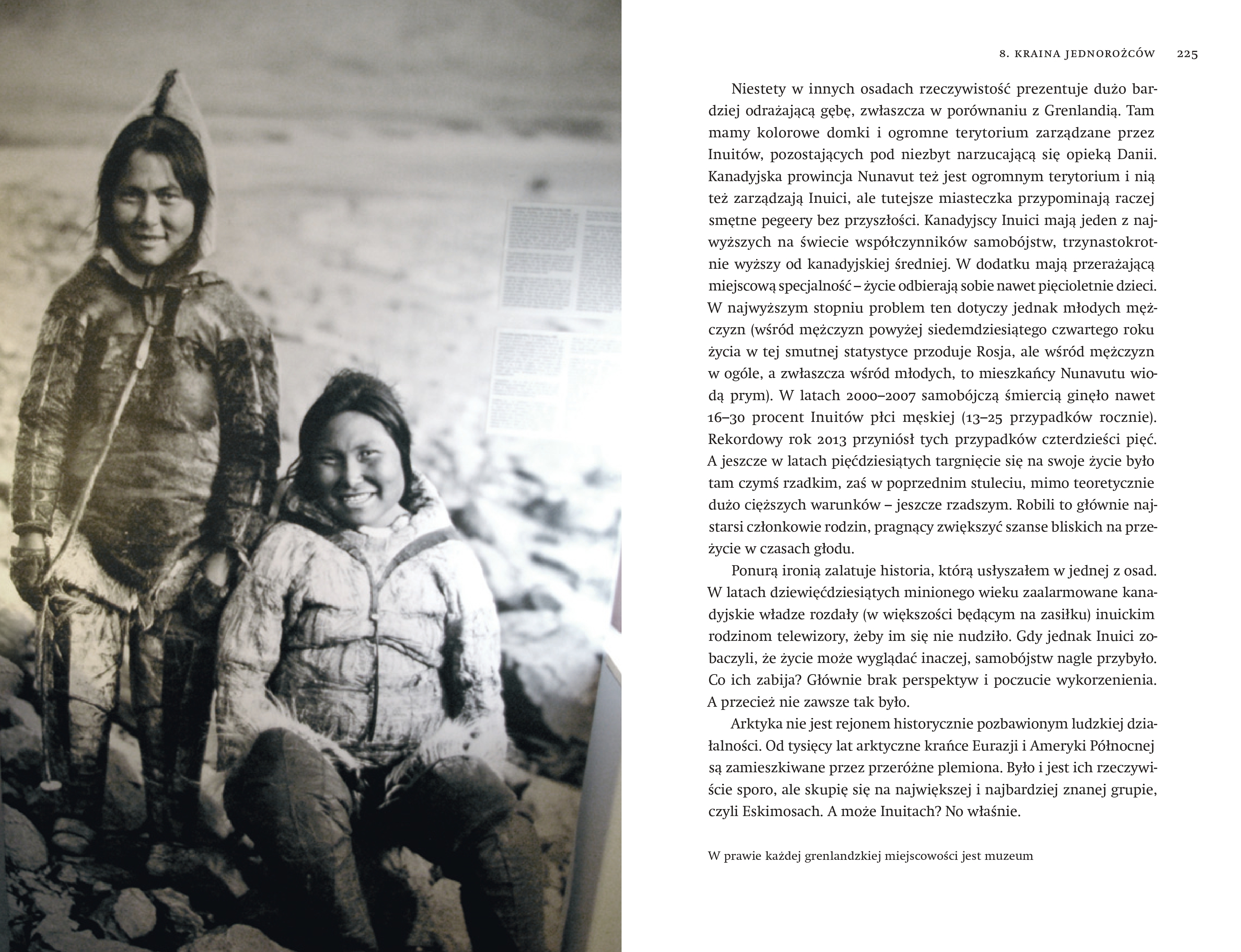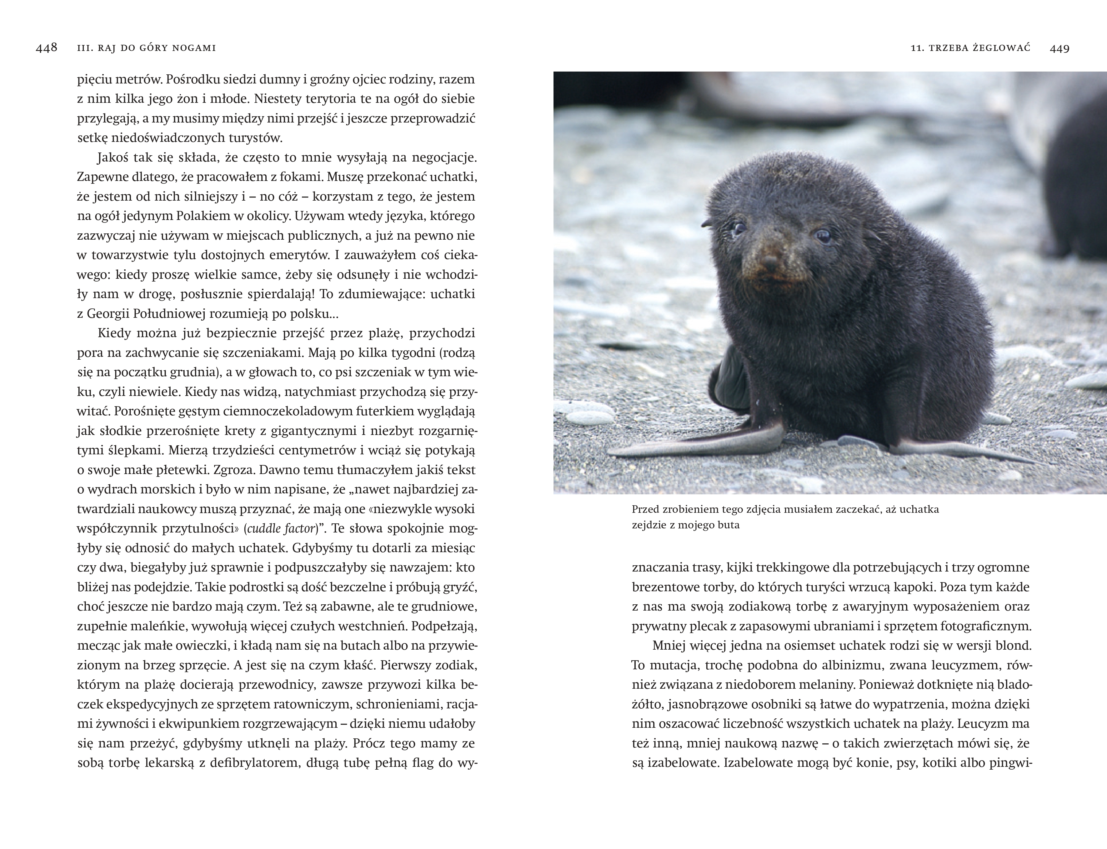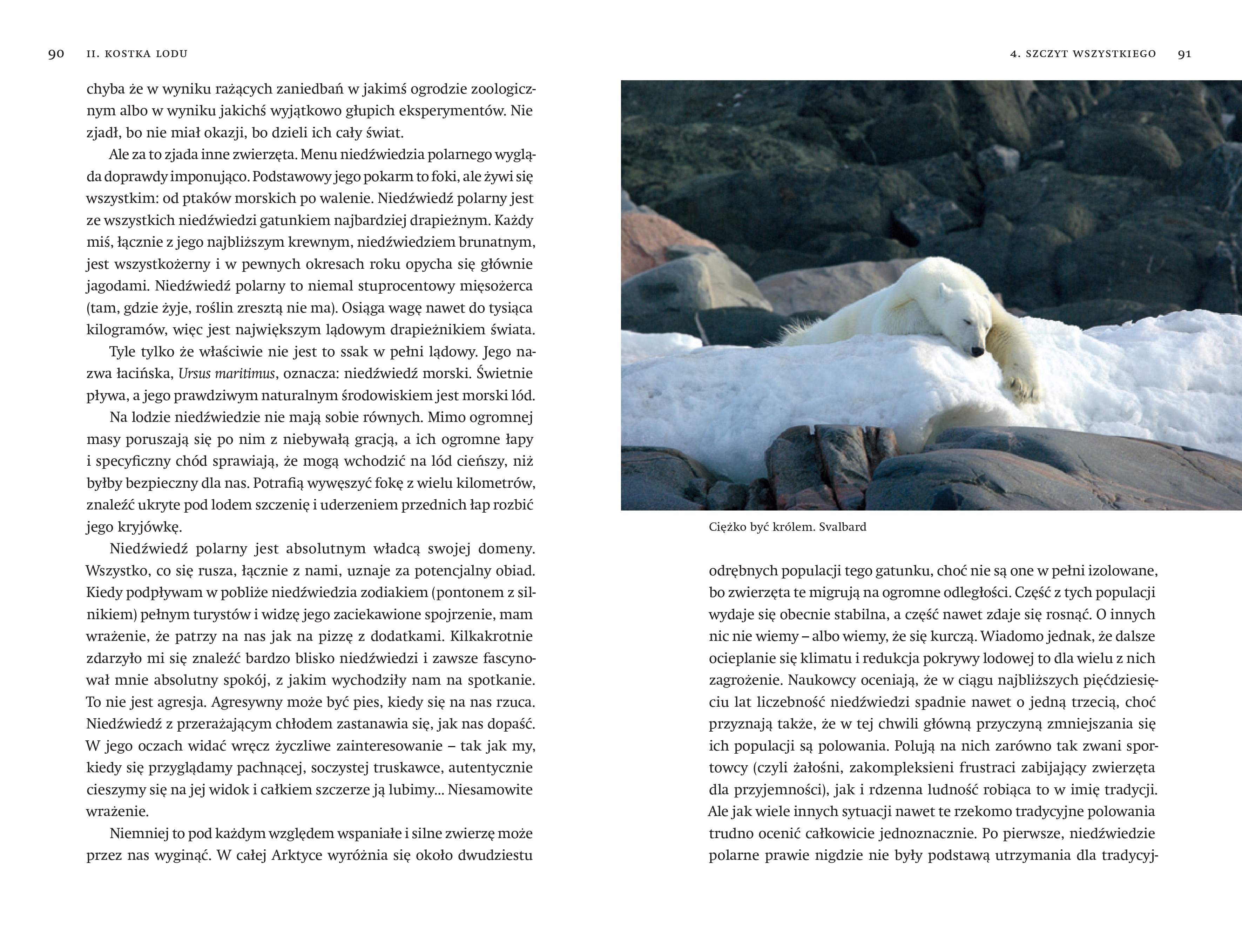 W swojej książce opowiada nie tylko o bliskich spotkaniach z dzikimi zwierzętami, ale też o pierwszych zdobywcach Arktyki i Antarktyki – o tych, którzy przeżyli, i o tych, po których słuch zaginął. O arktycznych plemionach, ich obyczajach (często zaskakujących), wierzeniach, i o tym, jak się skończył ich kontakt z białym człowiekiem. A także o najsmutniejszym dzieciństwie pewnego słodkiego puchatego ptaka – pochwodzioba.