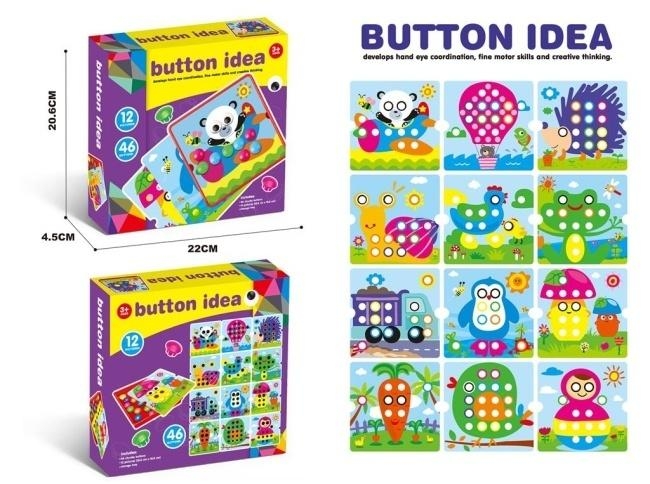 Button Idea to wyjątkowa układanka guzikowa zaprojektowana z myślą o wszechstronnym rozwoju najmłodszych. Zestaw składa się z 12 kolorowych plansz z urokliwymi ilustracjami oraz 46 dużych guzików, które są łatwe do uchwycenia przez małe rączki. Dziecko ma za zadanie uzupełnić obrazki, dopasowując odpowiednie kolory elementów do wolnych miejsc na grafice. Zabawka skutecznie rozwija zdolności manualne, uczy cierpliwości oraz pobudza kreatywne myślenie. Dzięki różnorodności motywów, od sympatycznej pandy i jeża po kolorową ciężarówkę, zabawa nigdy się nie nudzi. Całość została wykonana z bezpiecznych materiałów, a dołączona tacka ułatwia przechowywanie wszystkich elementów w jednym miejscu po zakończonej sesji układania. To doskonały wybór dla rodziców szukających zabawki łączącej naukę z czystą przyjemnością.