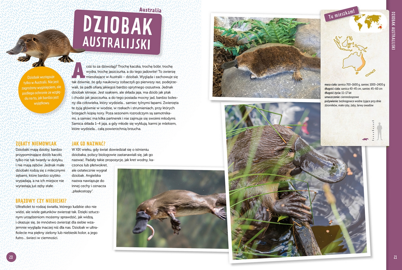 Jeśli chcecie poznać jeszcze więcej ciekawostek o fascynujących zwierzętach świata, przeczytać o ich zwyczajach i sprawdzić, czy są pod ochroną, koniecznie sięgnijcie po tę książkę. Dzięki jej kolorowym stronom odkryjecie tajemnice aż 15 gatunków, które można spotkać na całym globie.