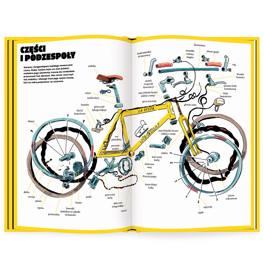Poznacie jego budowę i historię, poczynając od drewnianej maszyny biegowej, przez bicykl z ogromnym przednim kołem, po dzisiejsze holendry, BMX-y, rowery górskie i szosowe. Dowiecie się, kto wynalazł przerzutki i opony. Przeczytacie o tym, jak jazda na rowerze wpływa na nasze ciało i umysł, jak działa zmysł równowagi i na jaką nawierzchnię najprzyjemniej się upada (spojler: na łóżko!). Poznacie najróżniejsze sporty rowerowe – te oficjalne, jak rozmaite wyścigi czy bike polo, oraz te bardziej szalone, na przykład… mistrzostwa w jeździe pod wiatr. Wreszcie znajdziecie tu też podstawowe przepisy i znaki drogowe, wskazówki dotyczące stroju i inne praktyczne porady (wiecie, dlaczego warto schować do buta prawą sznurówkę?).