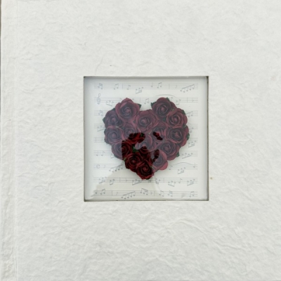 Centralnym elementem dekoracyjnym jest efektowna aplikacja z motywem serca ułożonego z czerwonych róż, umieszczona na tle subtelnego wzoru nut i pięciolinii. Połączenie romantycznego motywu kwiatowego z akcentem muzycznym tworzy harmonijną i oryginalną kompozycję.