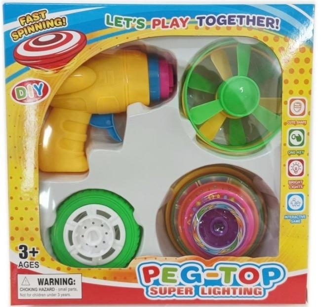 Peg-Top Super Lighting to zestaw stworzony z myślą o dzieciach powyżej trzeciego roku życia, które uwielbiają ruchome zabawki i efekty wizualne. Sercem zestawu jest poręczny pistolet startowy, dzięki któremu zabawa staje się niezwykle dynamiczna i łatwa nawet dla młodszych użytkowników. Wystarczy zamontować wybrany element na wyrzutni, nakręcić go i nacisnąć spust, aby wprawić go w szybki ruch obrotowy.