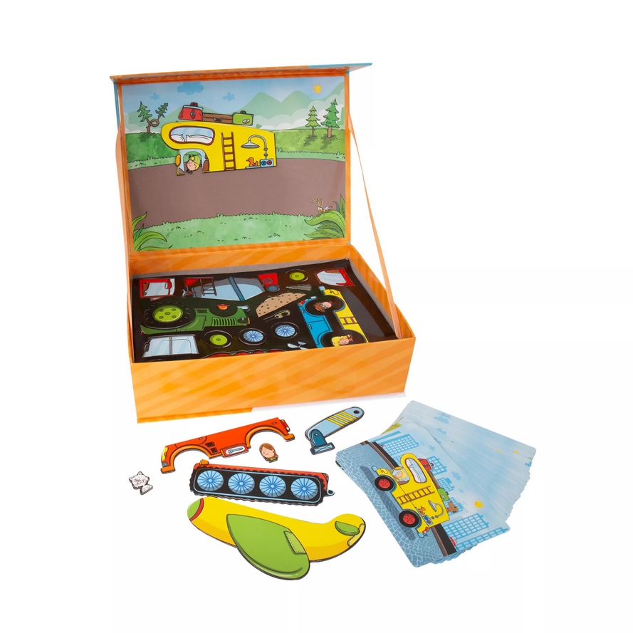 Zawartość zestawu: 54 magnesy z częściami pojazdów i pasażerami, 18 kart z zadaniami, 3 tła, 4 magnesy do mocowania teł, instrukcja, trwałe pudełko do przechowywania i zabawy