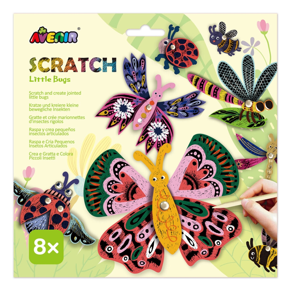 Dzięki prostemu wydrapywaniu kolorów dzieci mogą samodzielnie projektować motyle, biedronki, ważki i inne owady, a specjalne szpilki pozwalają łączyć elementy, tworząc ruchome mini-marionetki.