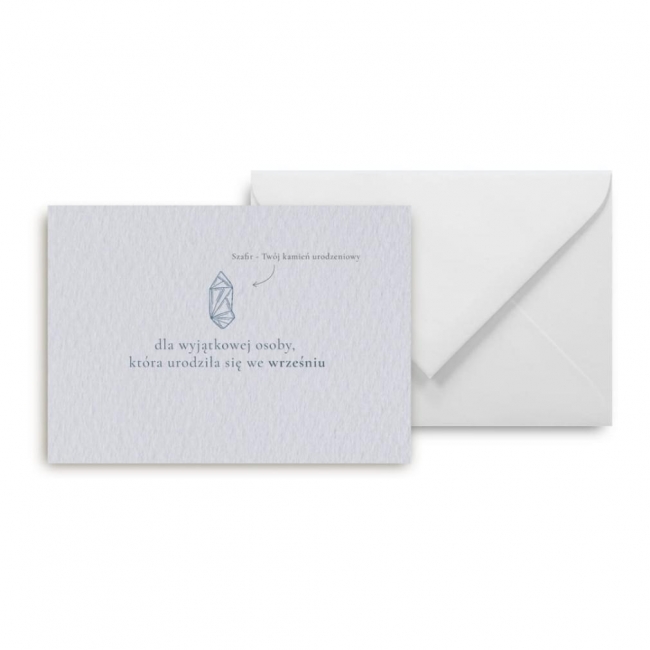 Delikatna i elegancka kartka ozdobiona szafirem kamieniem września. Symbolizuje mądrość, lojalność i szlachetność, dzięki czemu jest doskonałym wyborem jako dodatek do prezentu