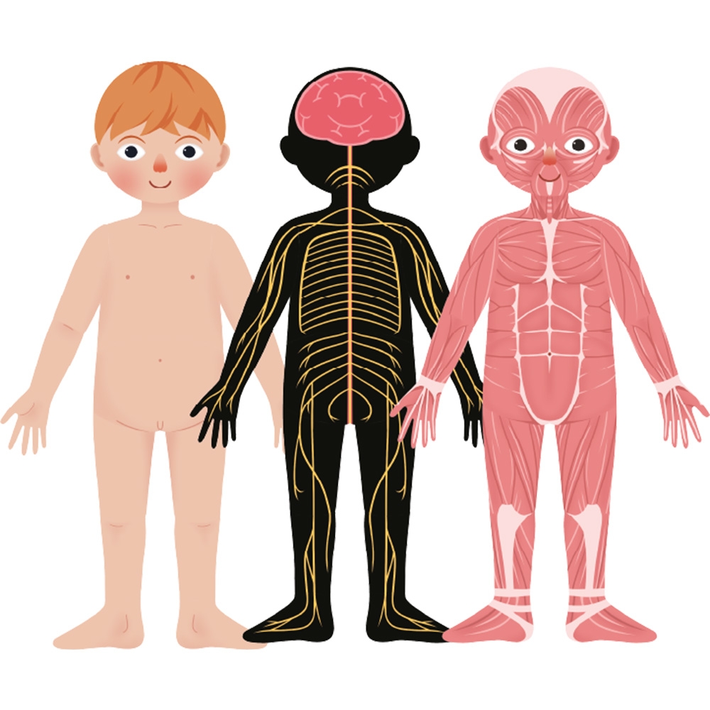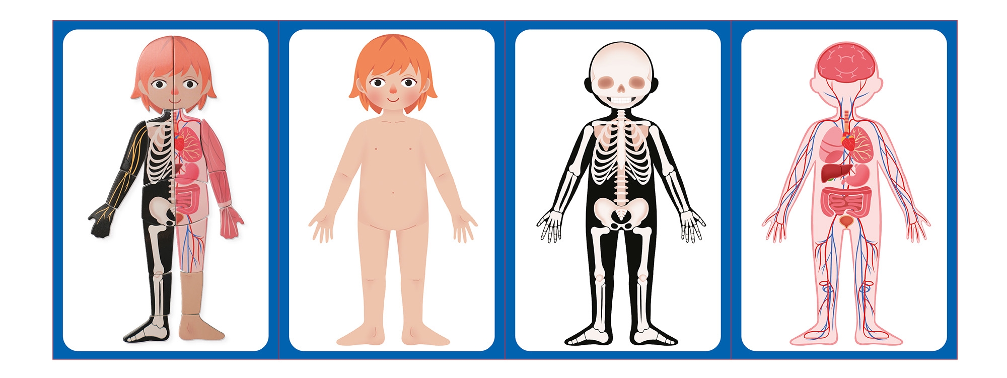 Zestaw składa się z 108 magnetycznych elementów, z których dziecko układa 6 różnych ilustracji przedstawiających najważniejsze układy ciała człowieka.