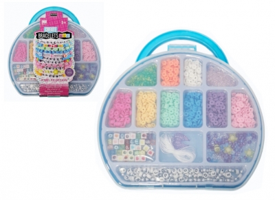 Zestaw do tworzenia bransoletek. W komplecie kolorowe koraliki gumowe i plastikowe, literki, zawieszki oraz gumki do nawlekania. Zabawka zapakowana w plastikowe pudełko z rączką. Zabawka przeznaczona dla dzieci od lat 3. Podane wymiary są wymiarami opakowania.