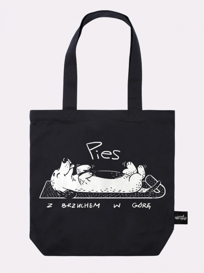 Torba PIES Z BRZUCHEM W GÓRĘ to manifest relaksu i hołd dla sportów kanapowych. Dla wszystkich, którzy odpoczynek traktują poważnie - z książką w jednej ręce i kotem w drugiej. Pojemna, praktyczna i z humorem - pomieści zakupy, notatnik i paczkę chrupek (dla kota albo dla właściciela).