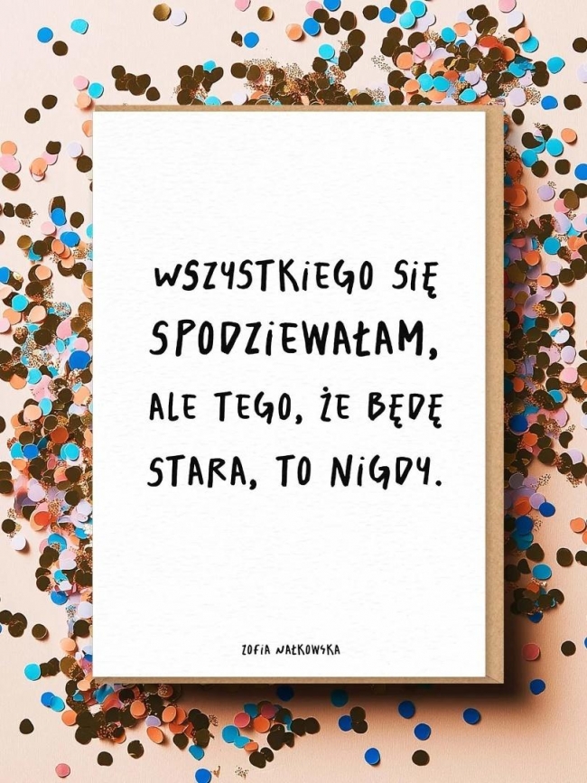 Zofia Nałkowska wiedziała, co mówi. Kartka WSZYSTKIEGO SIĘ SPODZIEWAŁAM to urodzinowa przemowa dla kobiet z dystansem - tych, które zamiast dramatu wybierają śmiech i literacki urok.Kartka okolicznościowa WSZYSTKIEGO SIĘ SPODZIEWAŁAM to doskonały pomysł na prezent dla przyjaciółki, mamy lub siostry. Sprawdzi się jako urodzinowa kartka pełna klasy, humoru i literackiego sznytu. Idealna dla kobiet, które lubią, gdy nawet życzenia brzmią jak dobra książka.