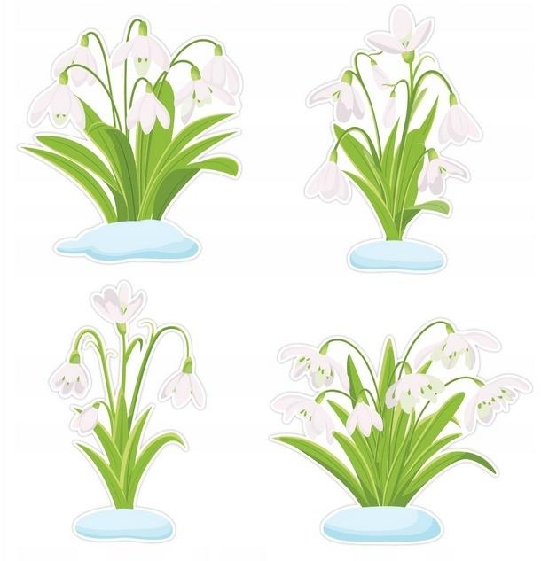 Zestaw składa się z 4 kompozycji przebiśniegów wyrastających ze śniegu - idealne do wiosennej dekoracji szkoły i przedszkola.