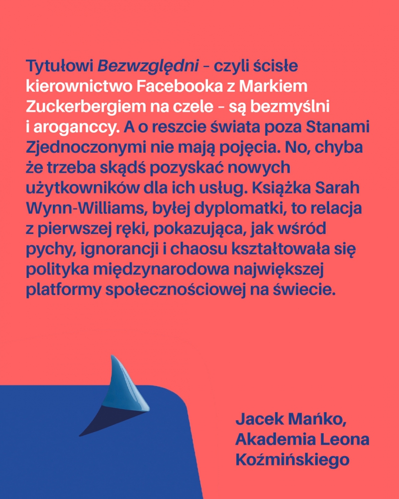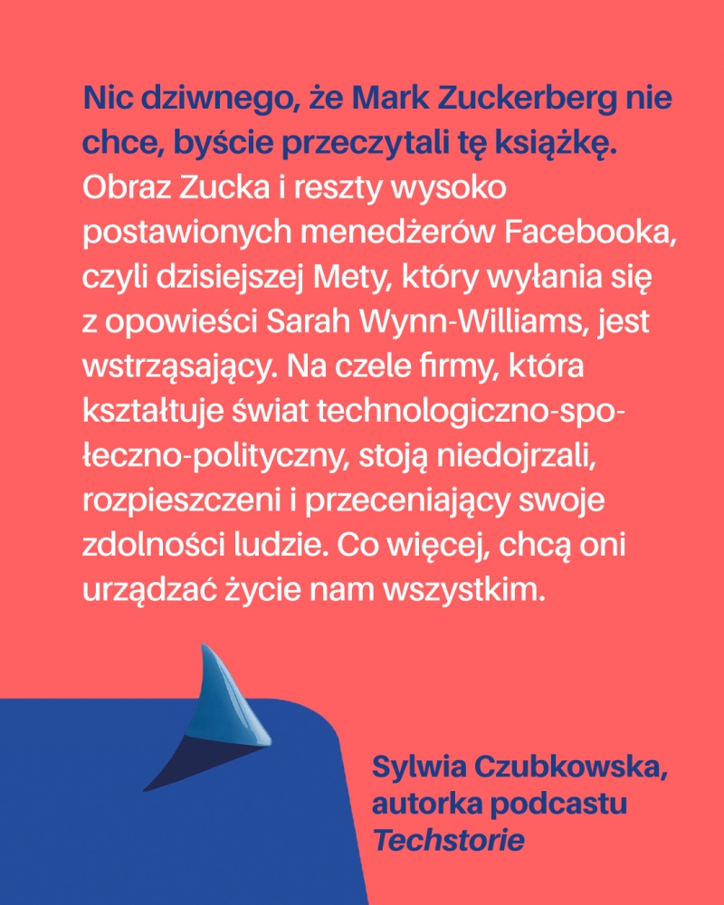 „Nic dziwnego, że Mark Zuckerberg nie chce, byście przeczytali tę książkę. Obraz Zucka i reszty wysoko postawionych menedżerów Facebooka, czyli dzisiejszej Mety, który wyłania się z opowieści Sarah Wynn-Williams, jest wstrząsający. Na czele firmy, która kształtuje świat technologiczno-społeczno-polityczny, stoją niedojrzali, rozpieszczeni i przeceniający swoje zdolności ludzie. Co więcej, chcą oni urządzać życie nam wszystkim” – Sylwia Czubkowska, autorka podcastu Techstorie