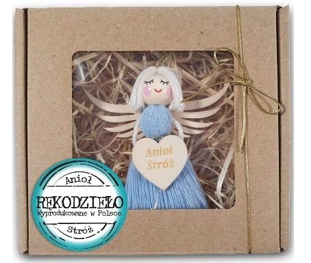Anioł Stróż - Rękodzieło wyprodukowane w Polsce. Figurka Anioła o wymiarach 10x7cm, ułożona na wełnie drzewnej, całość zapakowana w ekologiczne pudełeczko z okienkiem opasane złotym sznureczkiem.
