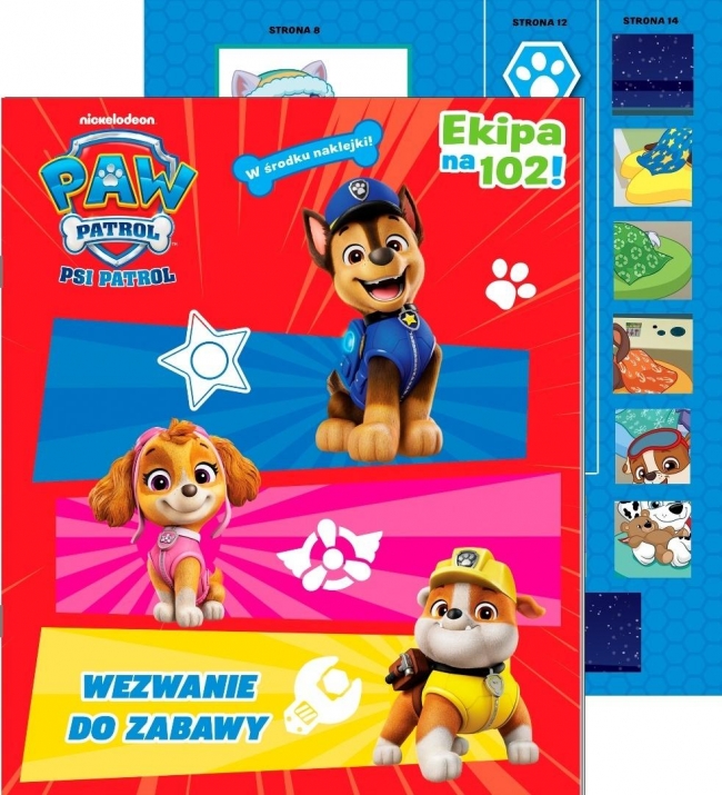 "Psi Patrol. Ekipa na 102!" zawiera zagadki, łamigłówki oraz kolorowanki z ulubionymi bohaterami w roli głównej. W środku również kolorowe naklejki z dzielnymi pieskami! Rezolutne szczenięta Marshall, Rubble, Chase, Rocky, Zuma i Skye oraz dziesięcioletni chłopiec Ryder nigdy nie odmówią pomocy potrzebującym-pomagaj pieskom w ich bohaterskiej misji poprzez rozwiązywanie różnorodnych zadań.